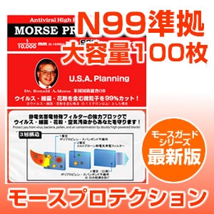 現在、国内に流通しているマスクのほとんどは花粉(約30ミクロン)や細菌(約5ミクロン) にしか対応できません。モースプロテクションは新型インフルエンザウイルス(0.1ミクロン前後)に対応しています。従来のマスクと一見同じでも、その能力はまったく違うのです。元米国国防総省のロナルド・モース博士によって考案されました。
